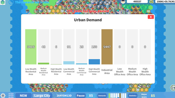 Job vacancies create demand for population, population creates demand for commercial supply, and commercial activities creates demand for industrial supply - this is the basic formula for economic development in Skyline: Urban Story. With rising education level, commercial and industrial growth can also generate demand for offices, driving the city into the cycle of industrial upgrades and expanding tax revenue.