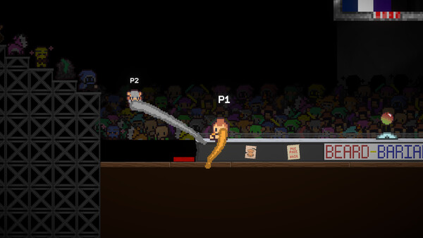 Each character can use their beard to attack, block and grab. Attacks can be aimed in any direction and charged for extra power. Blocking can be used to mitigate any damage, but block too much and it'll destroy your beard, leaving you defenceless for a few seconds. Grabbing (while having less range than attacking) can also be aimed in any direction and ignores blocking from opponents. Grabbing onto them will let you carry them around and throw them away. This combat system works like rock paper scissors where grab beats block, block beats attack and attack beats grab. Beard-based combat will grow on you, we promise! Additionally, you can fight alongside an ally in team battles, so maybe get your friend who’s a little too good at fighting games to carry you to victory!